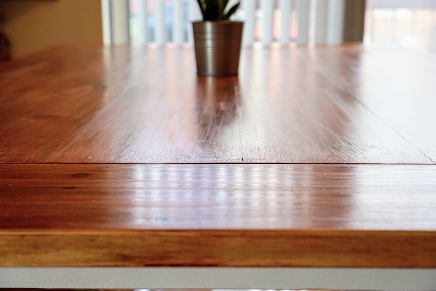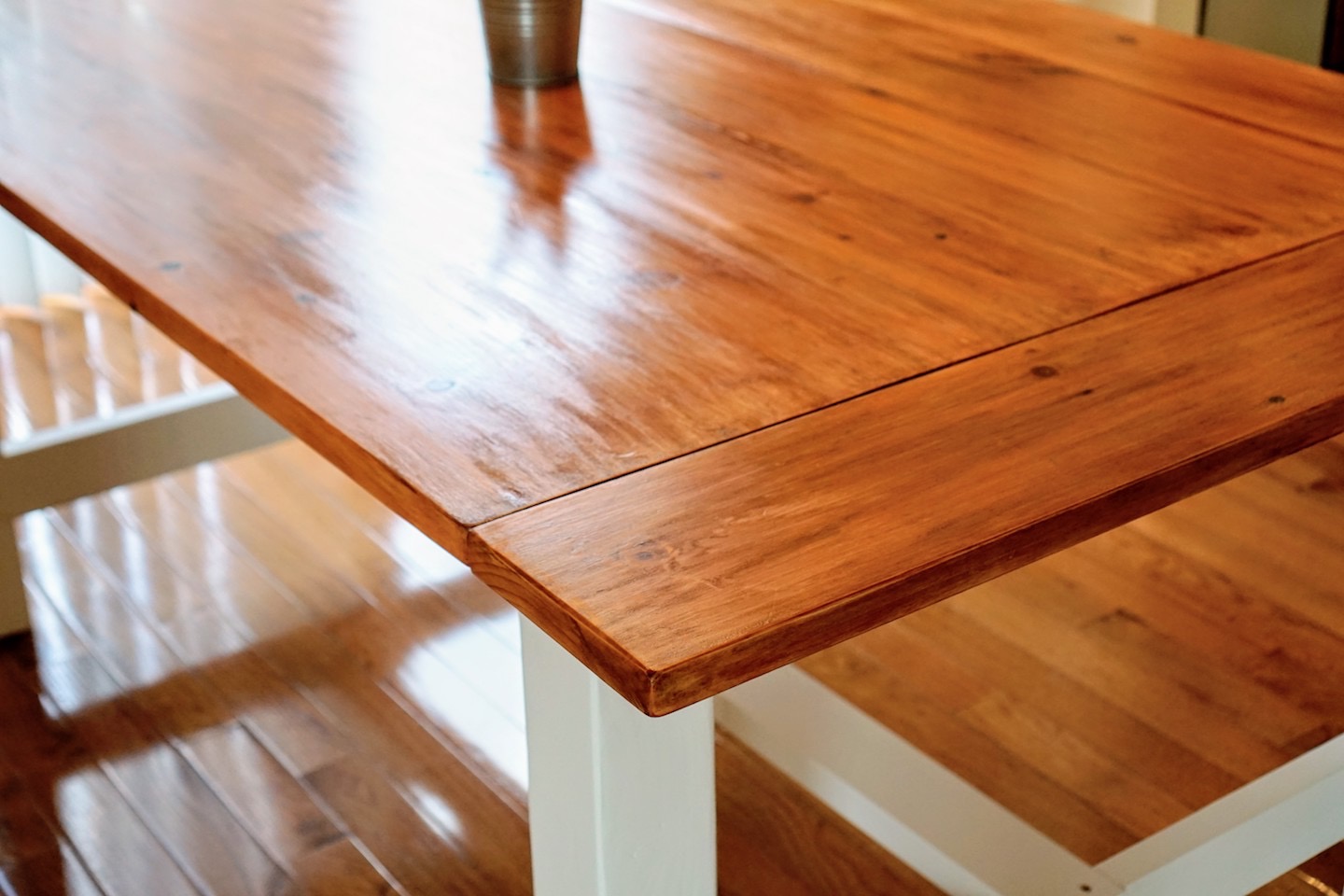 The final step! Finishing with polyurethane is necessary to help seal the table from the elements, including humidity. It will help prevent food and liquids from damaging the tabletop and excessive wood movement from humidity. Ideally, you will apply poly to the entire tabletop, including the bottom and all edges of the breadboards and tabletop. While you can choose any polyurethane finish, we recommend a wipe-on poly to make it easier to achieve uniformity.
