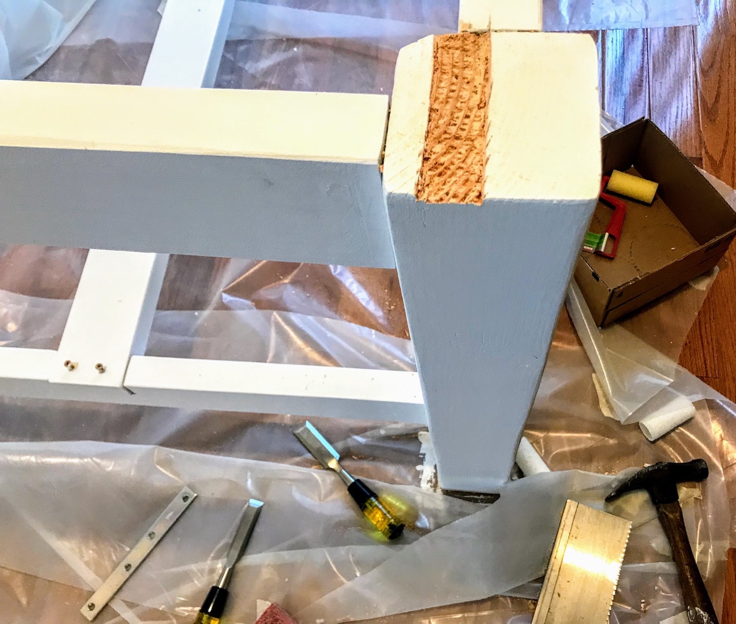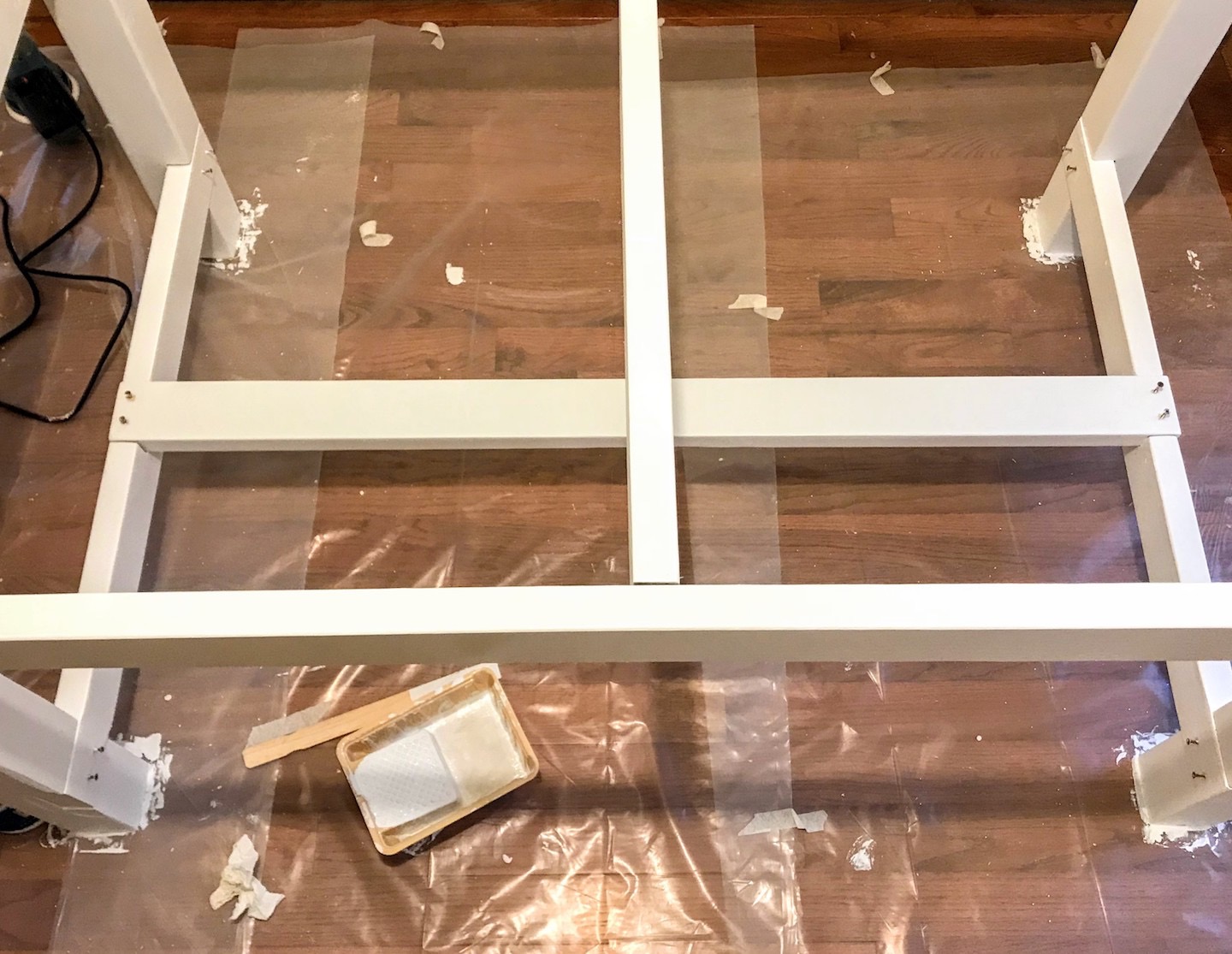 Now apply your favorite paint and/or stain to the frame and tabletop. We used an eggshell white paint for the legs, applied using a roller to get a smooth texture.