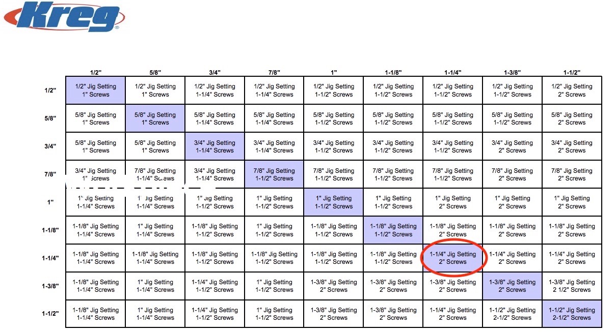 For the Kreg Jig, use a 1-1/4" Jig Setting with 4” collar depth. We get the jig setting and the screws to use from this chart, by finding the box intersecting the column and row for joining a 1-1/4" board to another 1-1/4" board. Remember, our tabletop boards are 5/4" (or 1-1/4") thick: