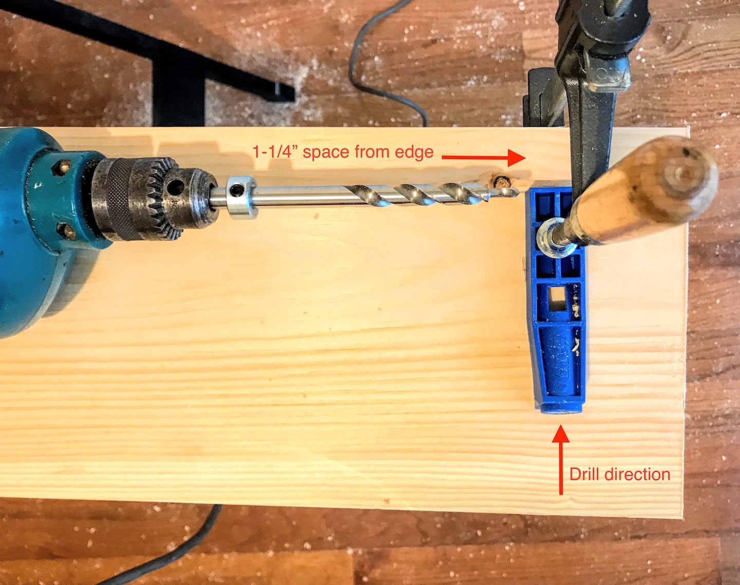Clamp the Kreg Jig 1-1/4" from the edge of a board so that you just barely drill through the edge of the wood. Try this first on a test piece to ensure it works for your selection of wood and that the screw does not come out the other end (which will be the top of your table). This is what we are doing: