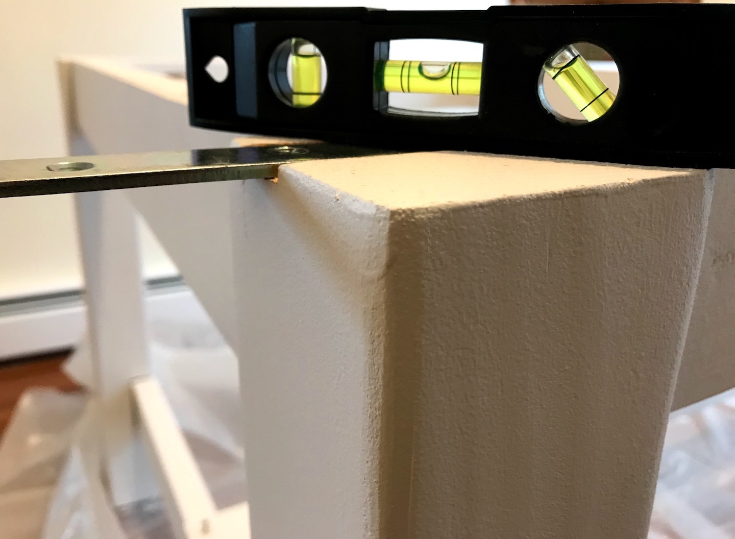 To install these mending plates, you must notch out part of the top of the leg to the equivalent depth of the metal plate so that the plate sits flush. Be sure that the notch is neither too deep nor too shallow so the mending plate sits flush: