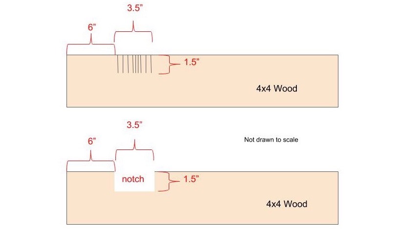 For the 4x4s, set your circular saw to a depth of 1-1/2" and make several cuts along the 3-1/2" length -- be sure to start the notch at the same place for each 4x4, otherwise the stretcher support will not be level. We notched about 6" from the bottom.