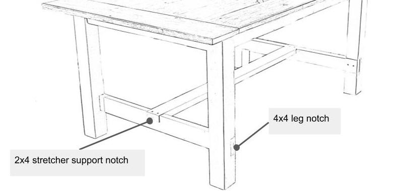 For notching the stretcher supports, use the same concept of a 1-1/2" depth and 3-1/2" length, but be sure to notch in the center of the stretcher support. This is where the stretcher will sit and it must be centered with the table.