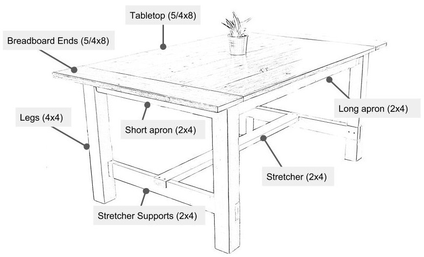 Our farmhouse table consists of the following major parts: 1) Tabletop and 2) Breadboard Ends, 3) Short and Long Aprons, and 4) Legs. Components 1 and 2 complete the tabletop, and components 3 and 4 complete the frame.