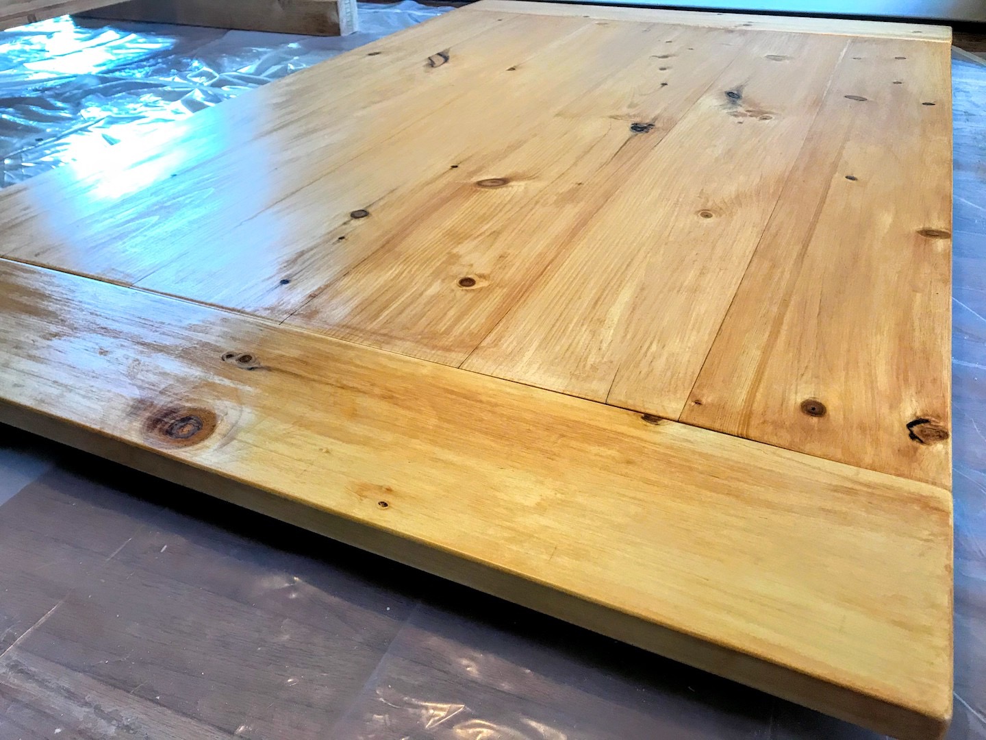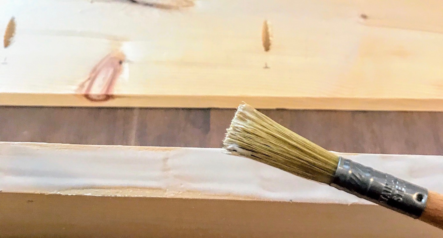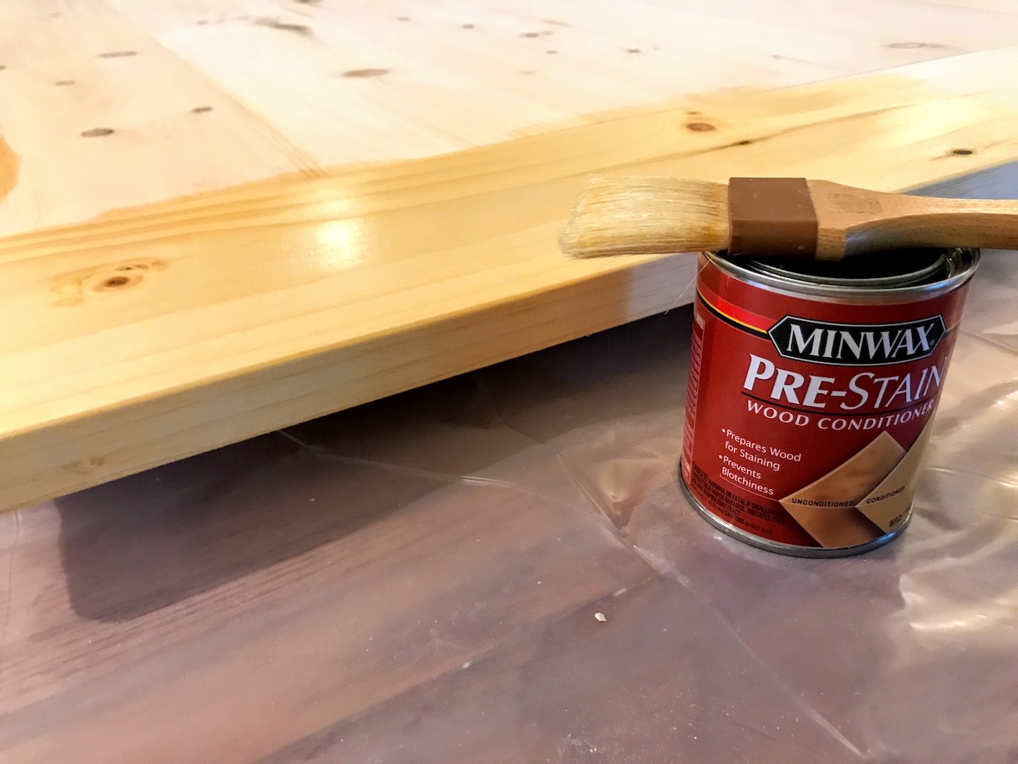 For stain, we recommend applying using an old cotton t-shirt instead of a brush to reduce blotching and make it easier to apply. Remember to remove the breadboards temporarily so that you can stain them on all sides. Also, since we are working with softwoods that readily take stain, start by applying a pre-conditioner to get the wood ready to take stain uniformly and prevent blotching.