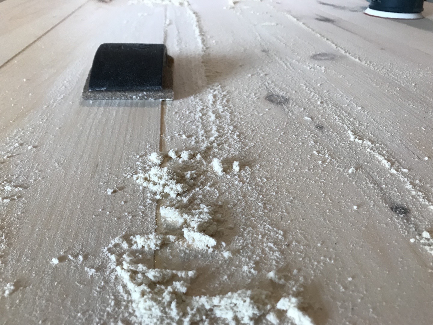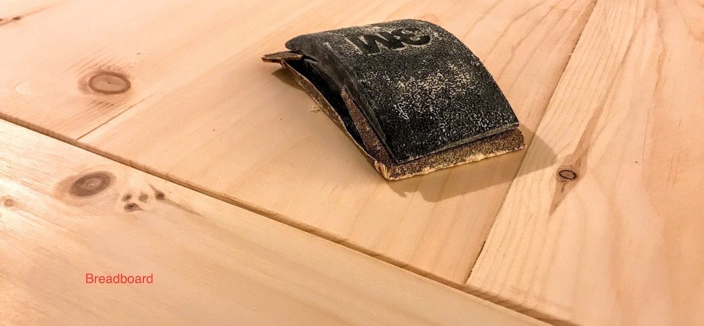 Give the tabletop a good sanding to achieve a nice smooth surface. Test that your surface is level throughout to ensure you're sanding evenly. You can use a power sander to help make this process faster. For the interface between the breadboards and the tabletop, you can sand a bit on each edge to create a v-notch effect. This is only for aesthetic reasons: