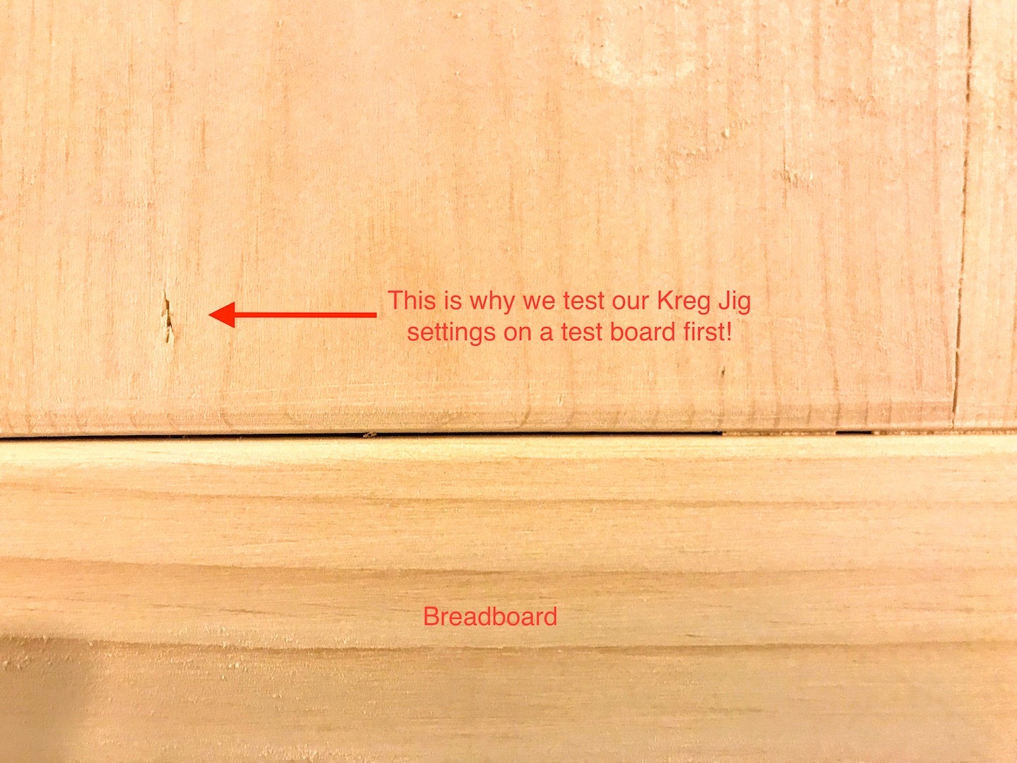 Note: although not mentioned in the Kreg Jig settings, we recommend attaching the breadboard to the "center" tabletop board normally -- using the same Kreg Jig settings as was used previously to attach the six tabletop boards. This gives some additional stability. This will still allow the tabletop to expand and contract, even though the center board is securely fixed. In our case, the center is board #3 and remember to drill on the underside of the table.