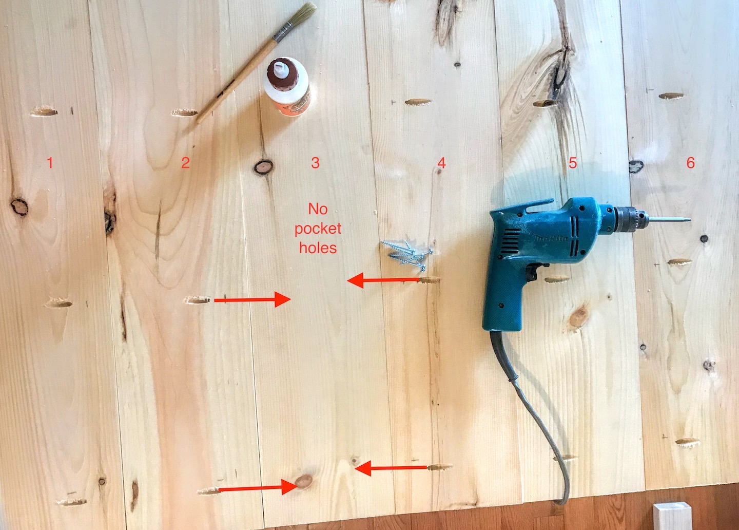 Before screwing the boards together, apply glue along the edges using a brush, and use clamps to keep the boards together and flat while drilling the pocket screws into each hole. Wipe off any excess glue well, otherwise it will be difficult to stain over it later.