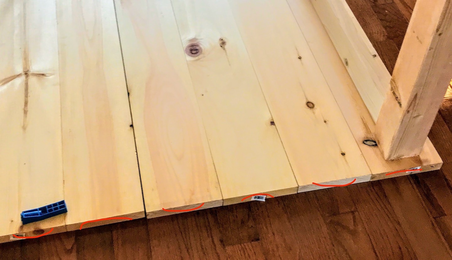 Make your cuts, if you have not done so already. We first assemble the tabletop so that the glue can dry while we work on the other steps. We will edge-glue the boards together, essentially creating one piece, and we'll use pocket screws to hold it together while it dries. You can take the screws out afterwards, or you can leave them in for additional support.