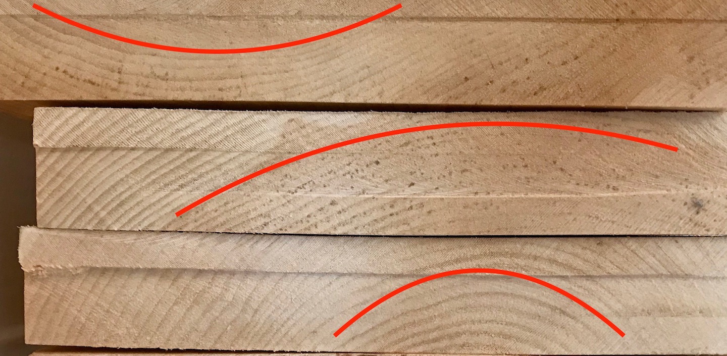 Remember that wood is affected by humidity and will expand and contract depending on humidity. The movement happens in the opposite direction of the growth rings. To compensate for this, you should alternate the direction of the growth rings. This is how you can see the growth rings: